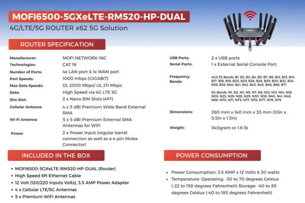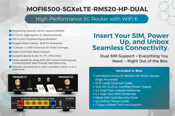 The MOFI6500-5GXeLTE-RM520-HP-DUAL is a high-performance 4G/LTE/5G router, powered by a 1.3GHz CPU, 1GB RAM, and 128MB ROM with ultra-fast DDR4 memory (1GB 2400MT/s). It supports WiFi 6 with built-in amplified signal boosters for enhanced coverage.